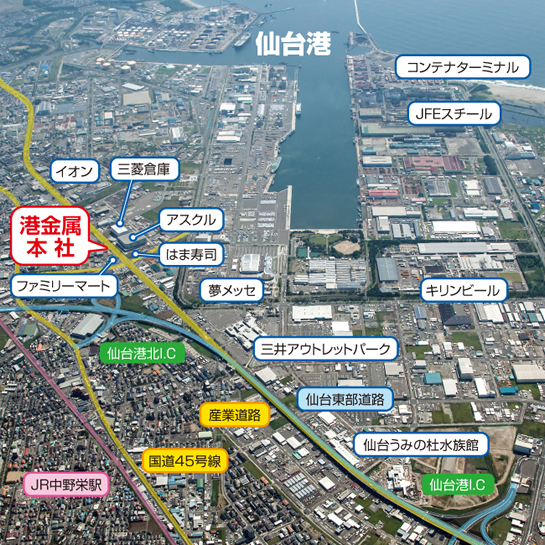 | ◆本社 | 宮城県仙台市宮城野区仙台港北1丁目6-19 電話番号/022-254-3608(代表) 担当直通/080-2846-7434 FAX番号/022-254-3601 e-mail/info@minato-kinzoku.jp |